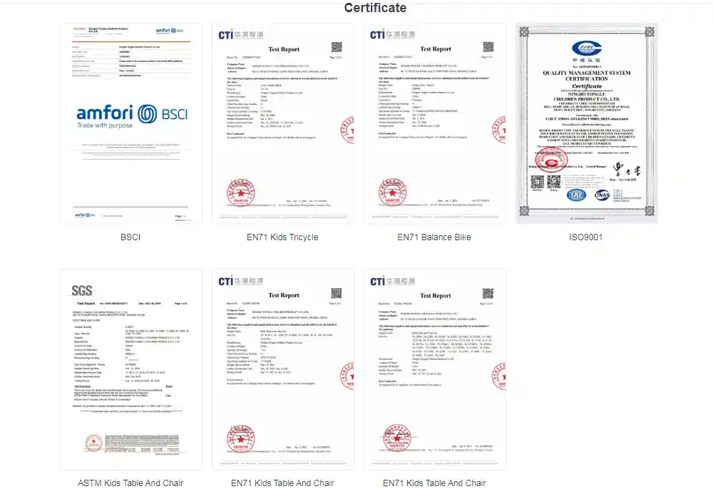 Zertifizierungen wie zEN71UndASTMzeigen an, dass unsereKinder- und Kleinkinderdreirad for wurde speziellen Tests unterzogen, um zu prüfen, ob die Materialien ungiftig sind, ob die Ecken Schnittverletzungen verursachen und ob die Teile fest sind, und hat die Sicherheitsstandards erfüllt.